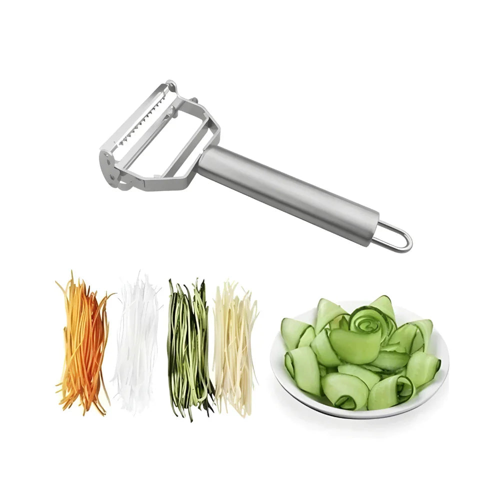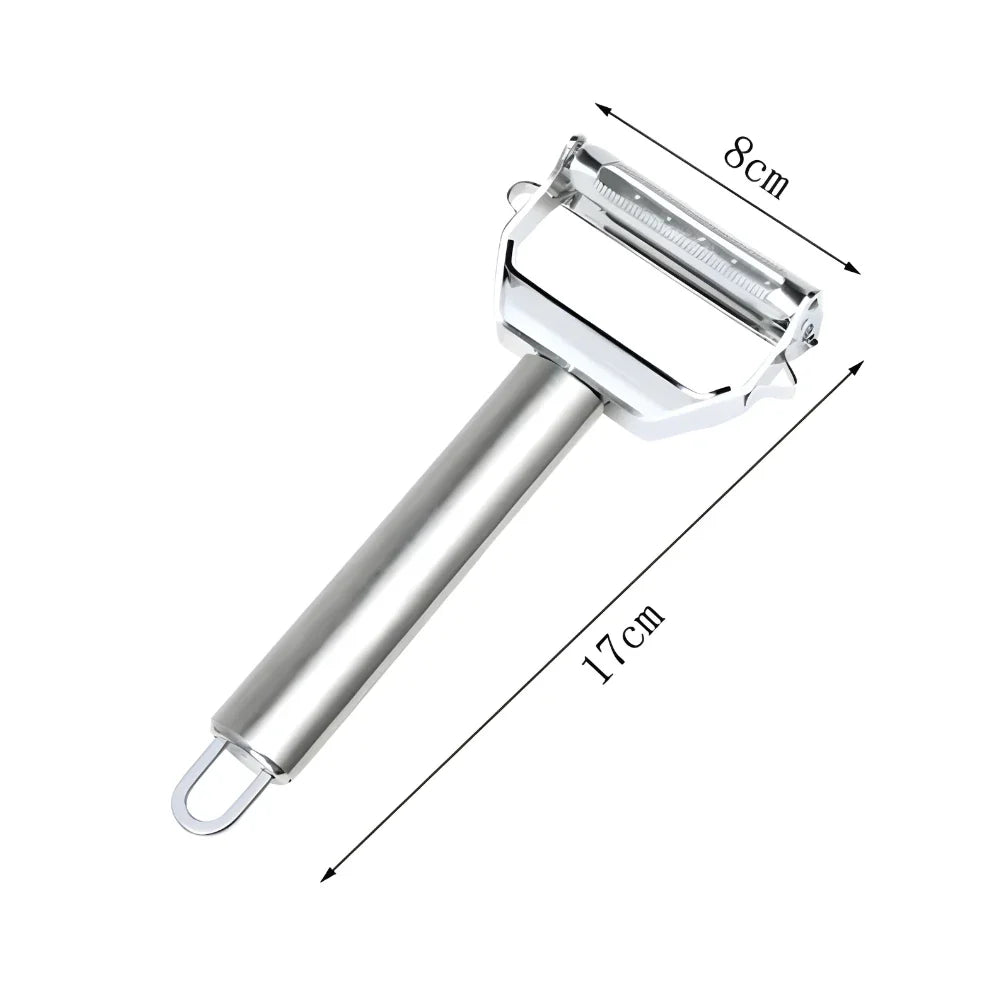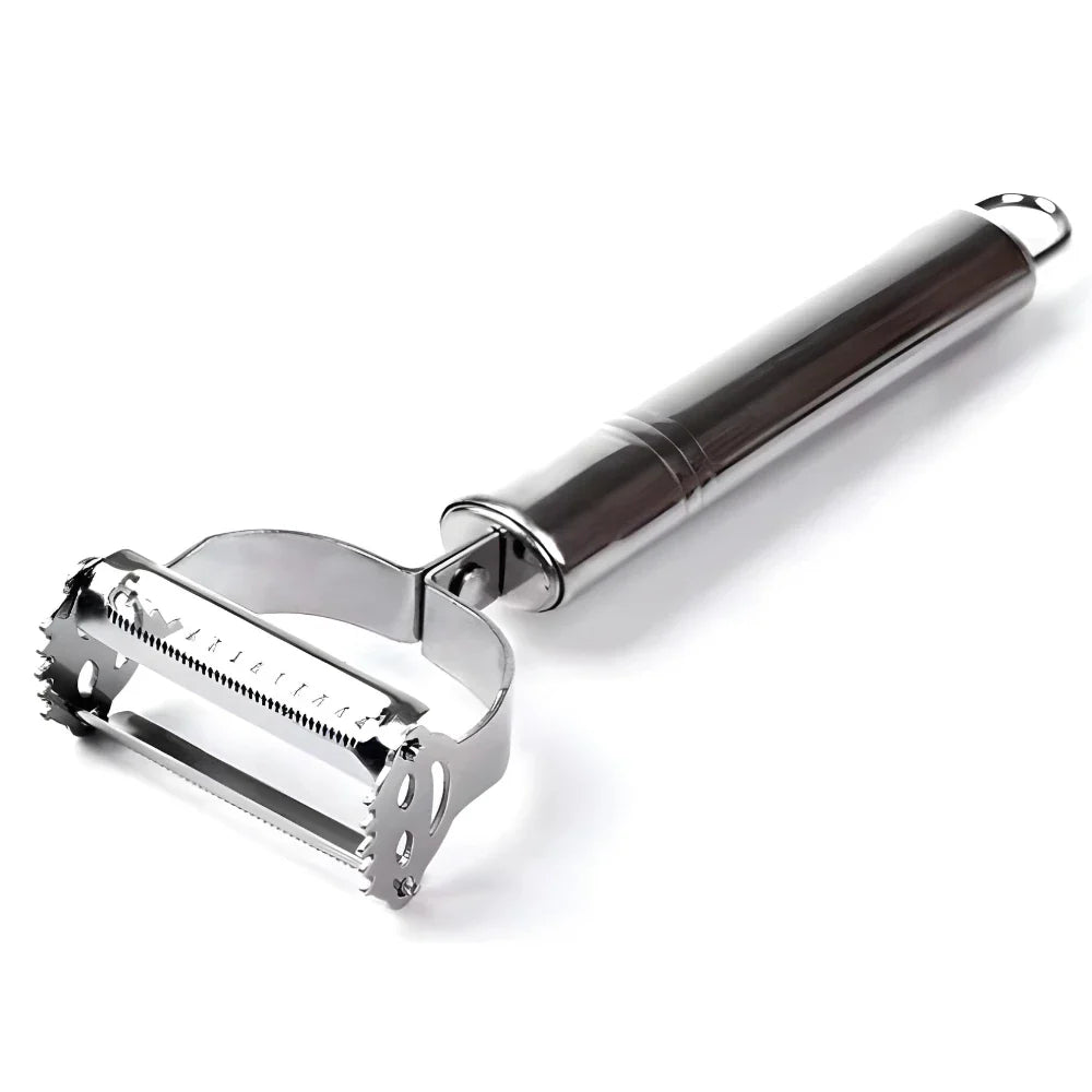 O descascador é um item de cozinha que consiste em uma lâmina de metal encaixada em um cabo, usado para remover a casca de certos legumes, como a batata e a cenoura, e frutas, como a maçã, a pera, etc.